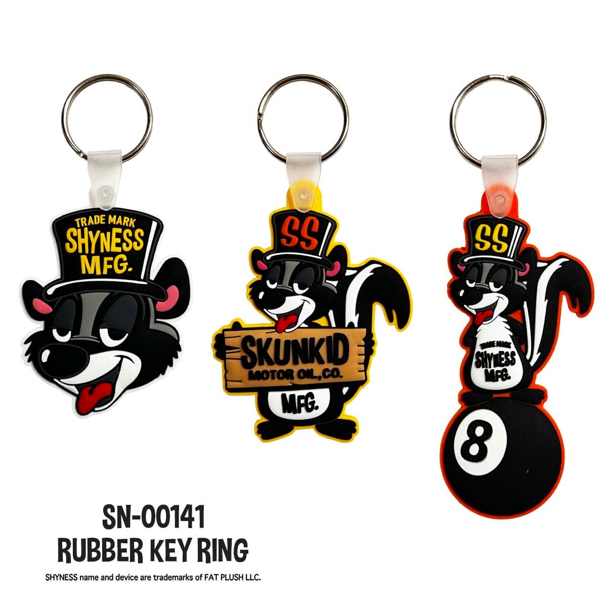 主に車内(バックミラーなど)に吊り下げて飾る、ぬいぐるみ素材で作られた8ボール型アクセサリーです。ホットロッドやカスタムカルチャーの定番アイコンであり、ドレスアップアイテムとして親しまれています。片面はSKUNKID柄になっています。 カラー:ブラック サイズ:φ68mm 紐の長さ:18cm