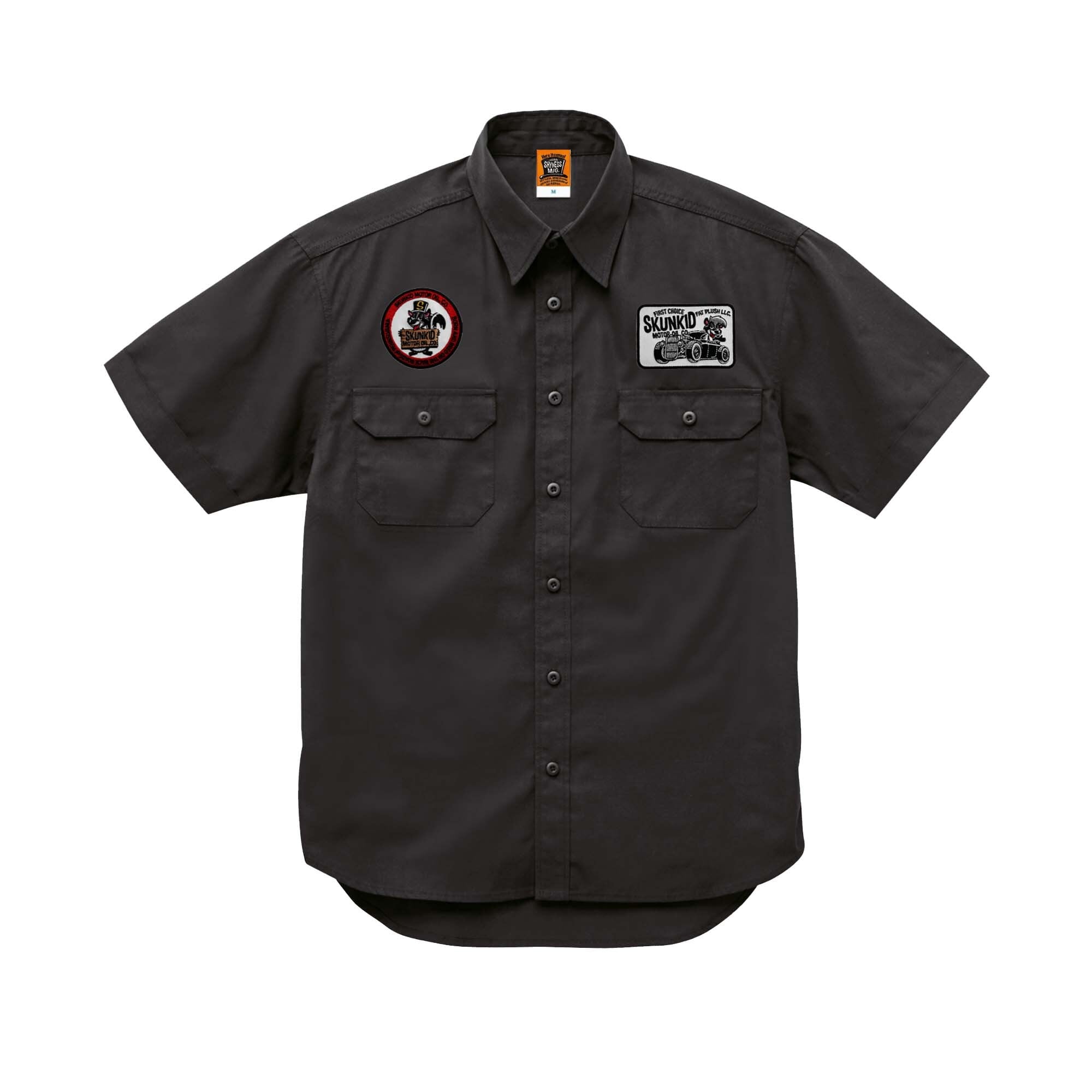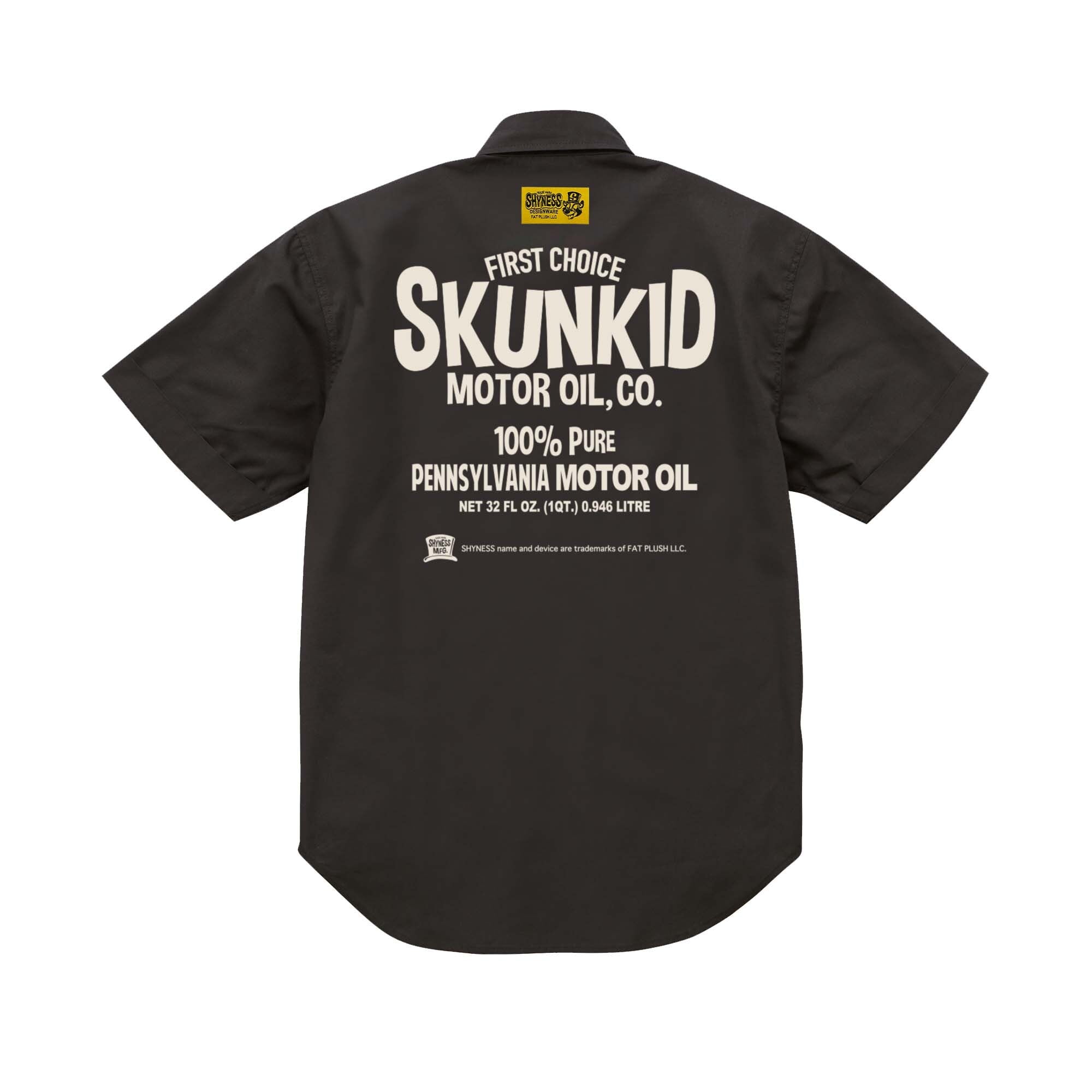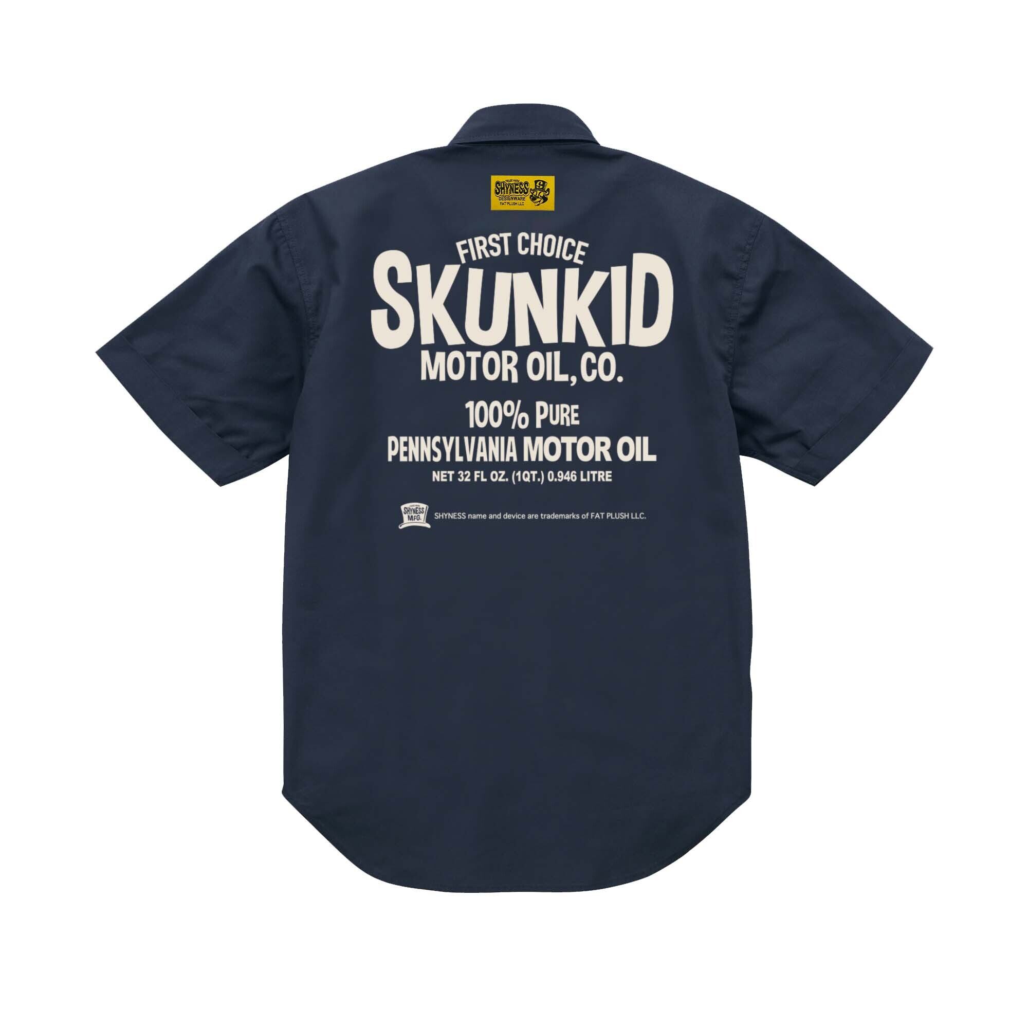 SHYNESS ORIGINAL SKUNKID MOTOR OIL 半袖ワークシャツ。前面左右両側にワッペン仕様。背面には織ネーム&プリント入り。おしゃれなシルエットでありながら、丈夫で機能性も抜群です。