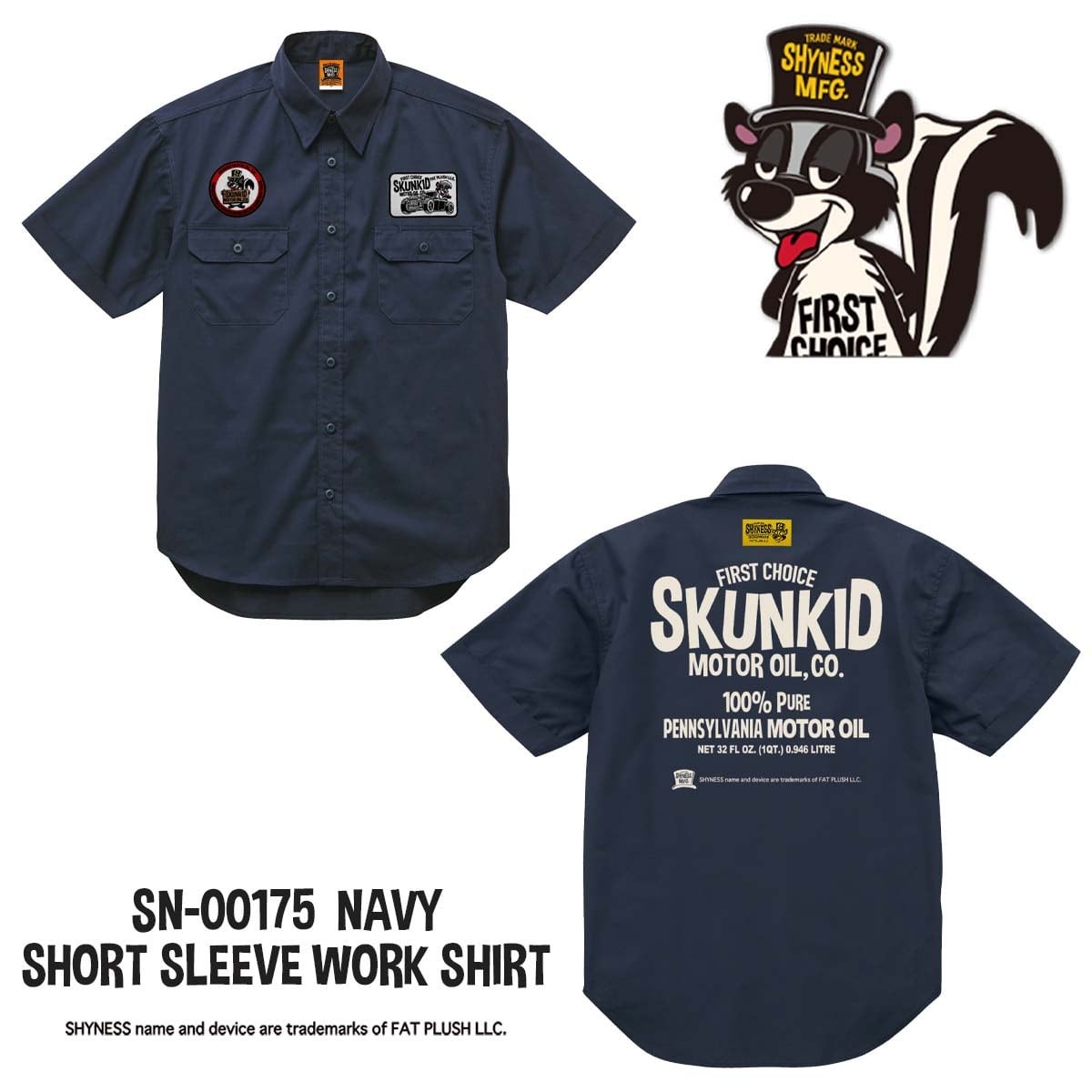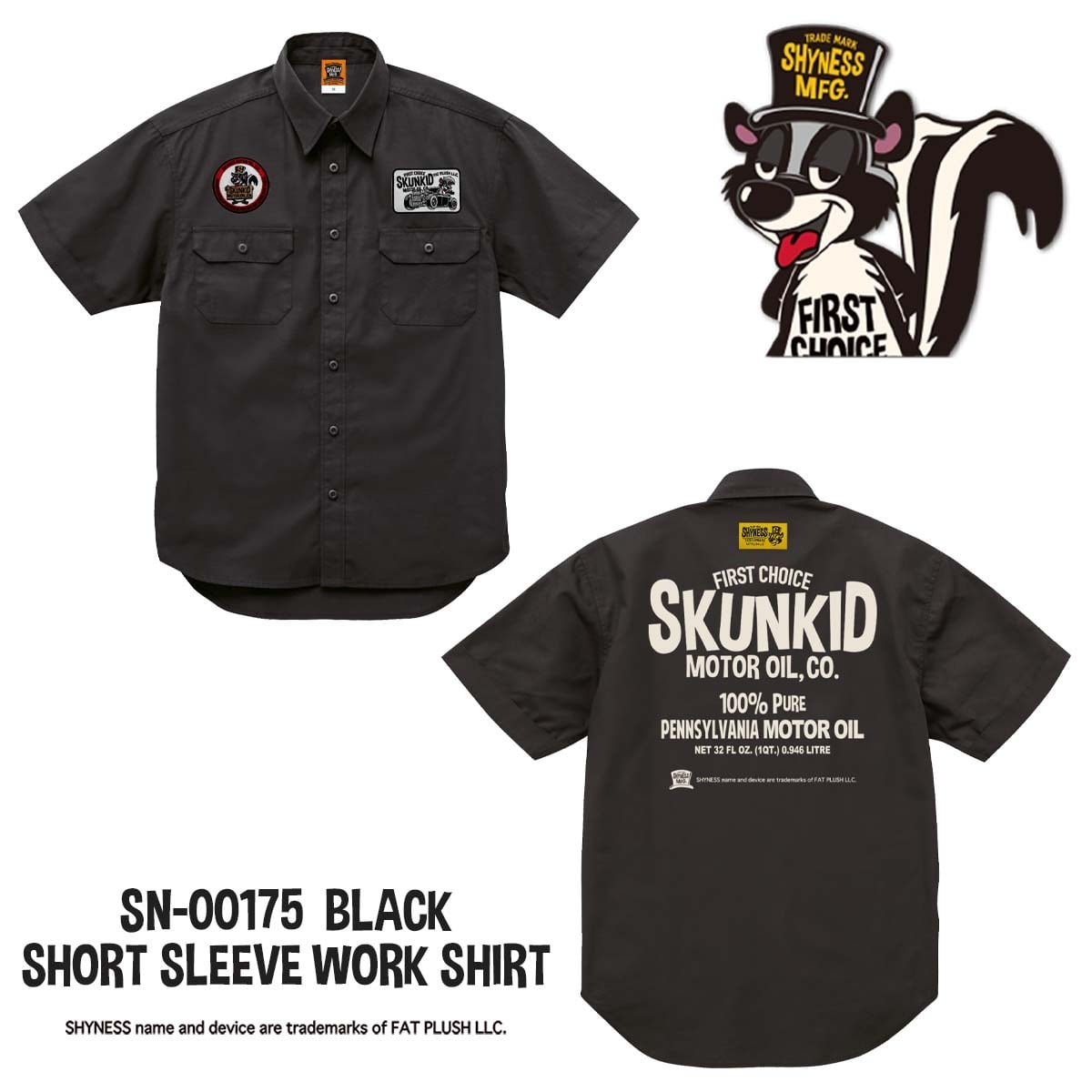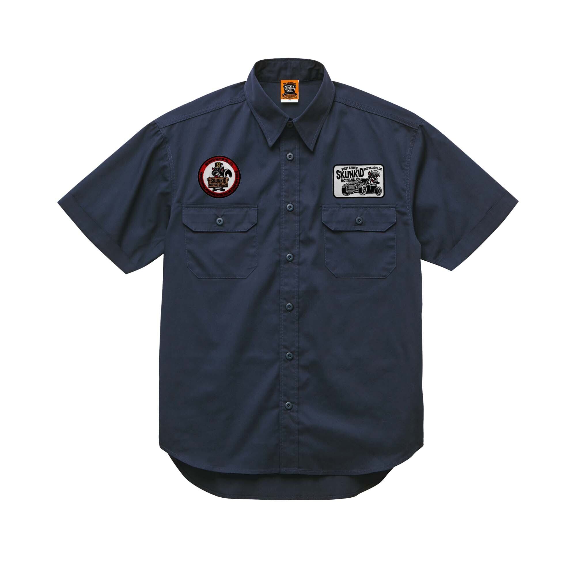 SHYNESS ORIGINAL SKUNKID MOTOR OIL 半袖ワークシャツ。前面左右両側にワッペン仕様。背面には織ネーム&プリント入り。おしゃれなシルエットでありながら、丈夫で機能性も抜群です。